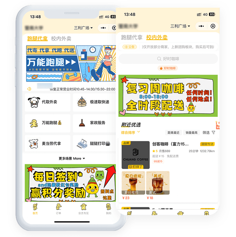 主要做校园内:外卖点餐,代取快递,帮买帮跑腿,信息发布,送餐到寝等服务,通过(微信+支付宝)小程序,平台覆盖校内食堂商家和校外周边商家,现在成为本校不可或缺的生活服务平台