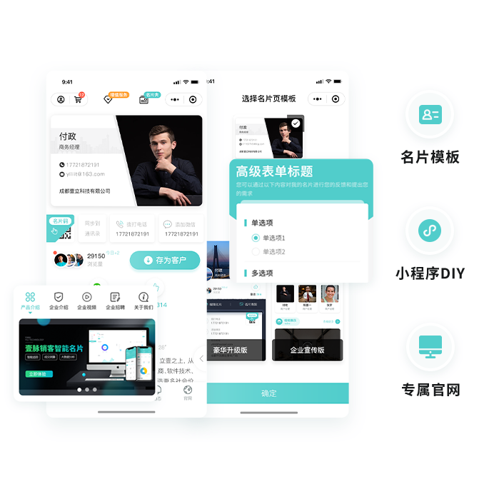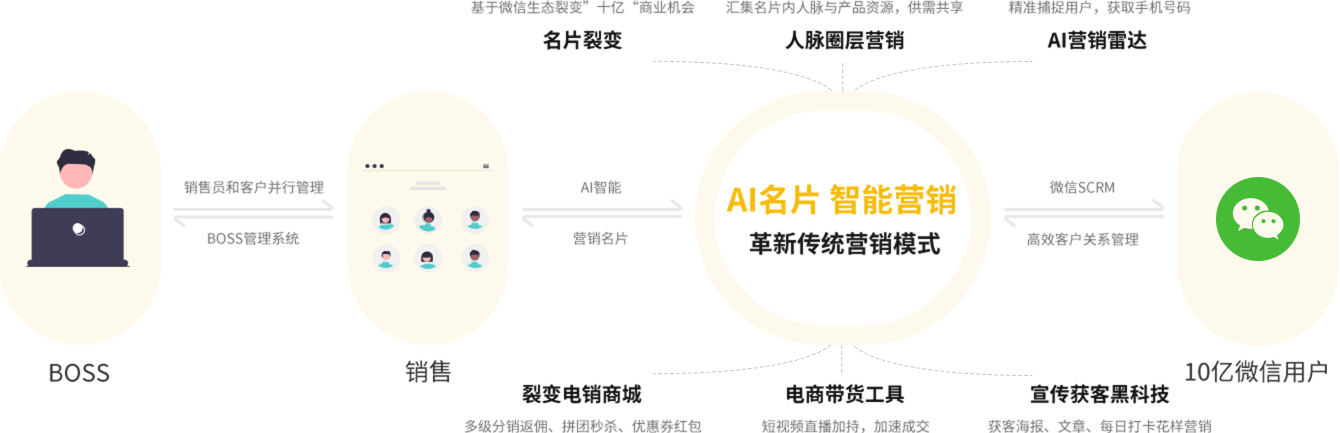 通过名片传播、裂变商城、短视频、直播等多类型营销模式形成裂变传播,智能获客。